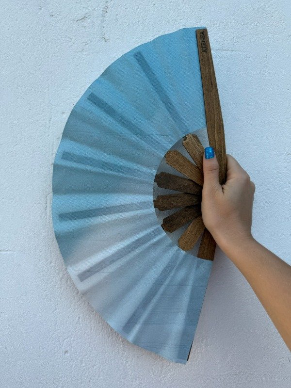 Abanico standard confeccionado a mano, con varillas de madera y lona sublimada con estampas 100% personalizadas.