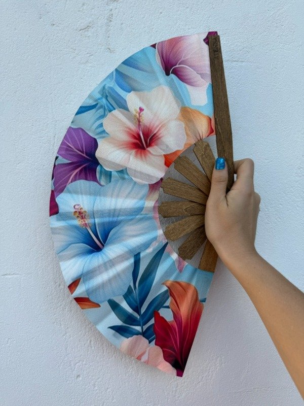 Abanico standard confeccionado a mano, con varillas de madera y lona sublimada con estampas 100% personalizadas.